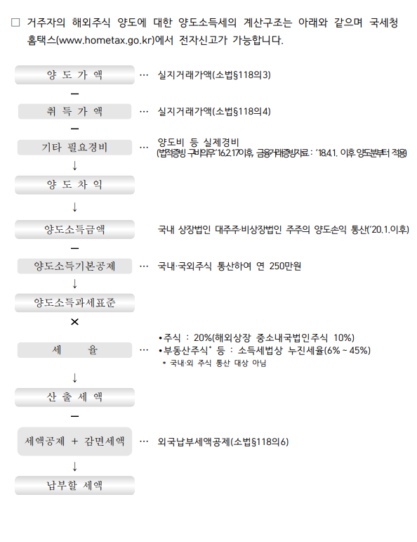 해외주식을 처분한 경우 예정신고 없이 양도소득세 확정신고기간에 주소지 관할 세무서에 양도소득 과세표준 확전 시고 납부만 하면 된다. 다만 해외주식의 처분일까지 계속하여 5년 이상 국내에 주소 또는 거소를 둔 거주자만 양도소득세 신고 납부 의무가 있다.