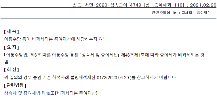 여기서 아동수당은 비과세 되는 증여 재산중 국가나 지방자치단체로부터 증여받은 재산의 가액에 포함되어 증여재산으로 보지 않는 것이다.