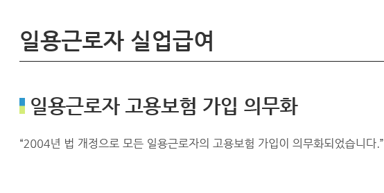 일용직 근로자도 고용보험이 강제되어있다보니, 고용보험에 대한 내용도 같이 보장받을 수 있다. 대표적이 고용보험 보장이 실업급여 및 구직수당 재취업수당등이다.