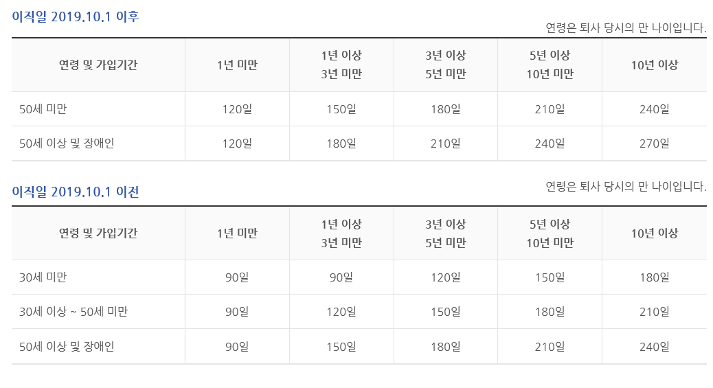 고용보험 가입기간에 따라 120일에서 최대 270일 범위내에서 정해지며, 퇴직전 평균임금의 60%를 받게된다.