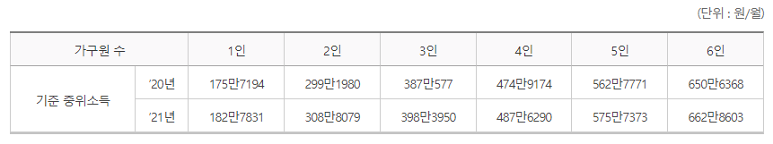 중위소득이란 국민기초생활보장법 제6조 2에 따라 통계자료에 따른 경상소득의 중간값에 소득 평균 증가율 등을 반영하여 가구 규모별로 산정한 소득으로 중앙생활보장위원회에서 발표한다.